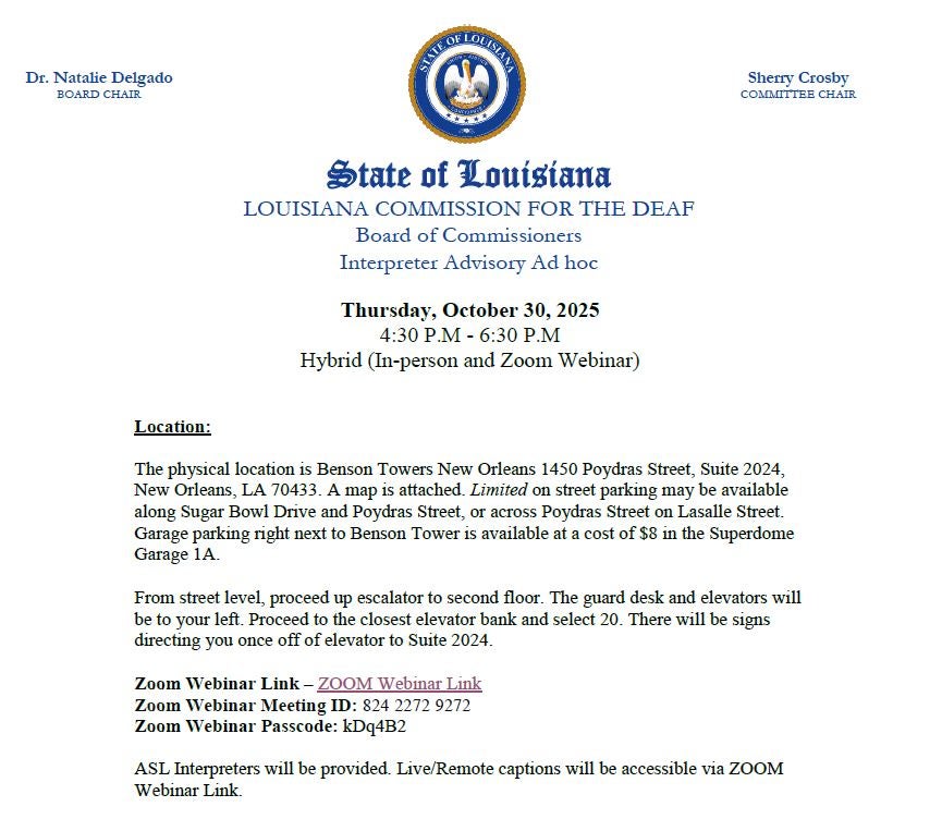 The Louisiana Commission for the Deaf Board of Commissioners voted to create a short-term adhoc committee in order to define the objectives, goals, qualifications and membership criteria for the future Interpreter Advisory Committee. The official name of the committee will be established at a later date. This committee will begin hosting a series of hybrid public meetings with board approved committee members beginning Oct 2025. The future Interpreter Advisory Committee will be tasked with general responsibilities of advising the Board of Commissioners on topics such as registration requirements, reviewing and investigating grievance, issuing recommendations for disciplinary action, if warranted, informing interpreter qualifications and other important duties. These sessions aim to develop the criteria for the future Interpreter Advisory Committee.